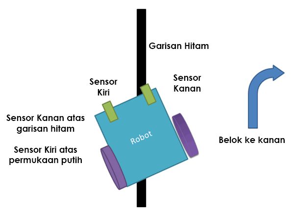 Dalam hal ini, ia berlaku apabila Sensor Kiri mengesan garisan Hitam, manakala Sensor Kanan mengesan lantai putih. Dalam keadaan ini, kita perlukan Robot berputar ke Kiri (lawan jam). Untuk melaksanakan ini, Motor Kiri perlu berputar ke belakang (reverse) dan Motor Kanan berputar ke hadapan (forward). Hasilnya, Robot bergerak ke kiri.