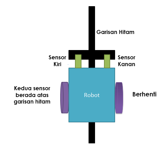 Dalam kes ini, kedua-dua sensor mengesan garisan. Ini bermakna kereta telah sampai ke garisan penamat. Kedua-dua motor berhenti berputar. Hasilnya, kereta berhenti.