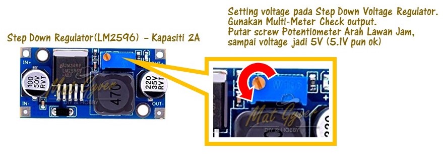 Perlu ada module LM2596. Ada diterangkan dalam tutorial ini di bahagian bawah.
