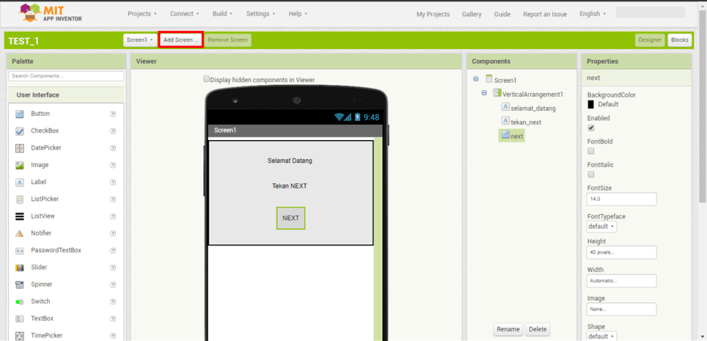 Buat gabungan yang sama pada Screen2 tetapi Screen1 diletakkan diruangan Text.