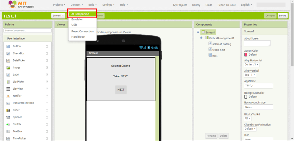 Selesai install, anda perlu linkkan MIT AI2 Companion dengan MIT App Inventor. Klik ‘Connect’ dan pilih AI Companion.
