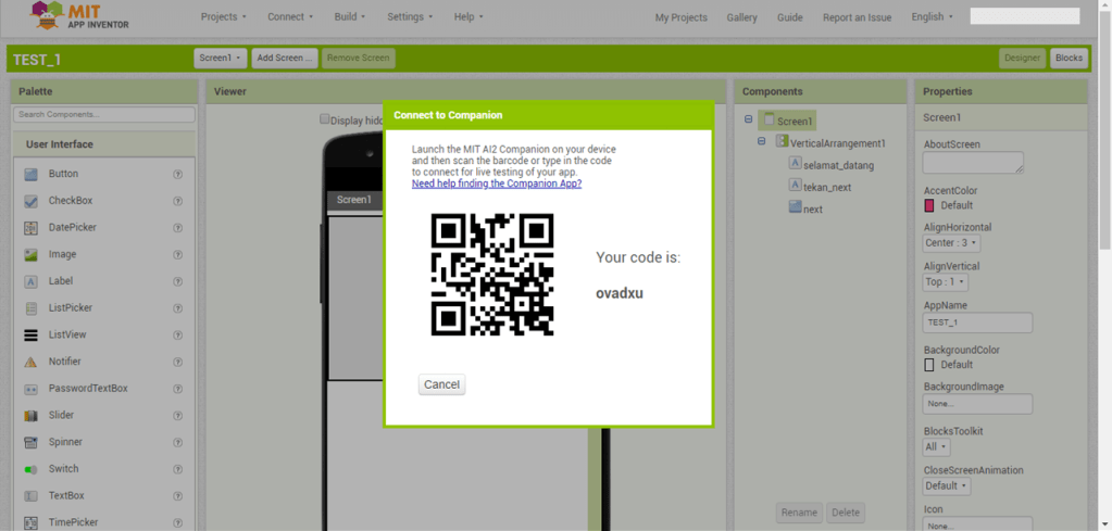 Setelah selesai, anda boleh menguji aplikasi anda pada telefon bimbit. Anda perlu install aplikasi MIT AI2 Companion terlebih dahulu yang boleh didapati di Google Play Store. p/s: Aplikasi MIT AI2 Companion untuk iOS masih di peringkat beta testing.