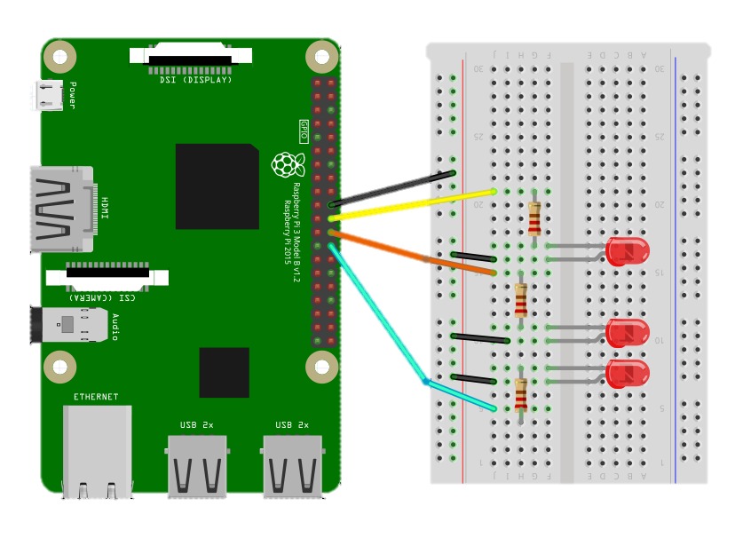 #Bahagian ini adalah list library yang akan #digunakan dalam coding import RPi.GPIO as GPIO import time #set pin GPIO ke BCM GPIO.setmode(GPIO.BCM) #declare pin GPIO yang digunakan GPIO.setup(25, GPIO.OUT) GPIO.setup(8, GPIO.OUT) GPIO.setup(7, GPIO.OUT) #coding utama yang akan dijalankan GPIO.output(25,GPIO.HIGH) GPIO.output(8,GPIO.LOW) GPIO.output(7,GPIO.LOW) time.sleep(3) #time.sleep adalah sama seperti delay yang digunakan dlm Arduino #3 bersamaan dengan 3 saat GPIO.output(25,GPIO.LOW) GPIO.output(8,GPIO.HIGH) GPIO.output(7,GPIO.LOW) time.sleep(3) GPIO.output(25,GPIO.LOW) GPIO.output(8,GPIO.LOW) GPIO.output(7,GPIO.HIGH) time.sleep(3) GPIO.cleanup()